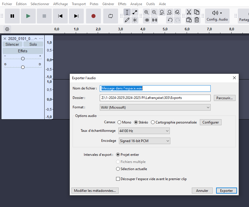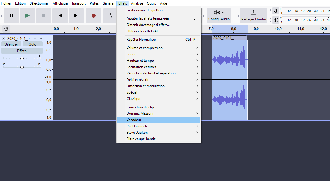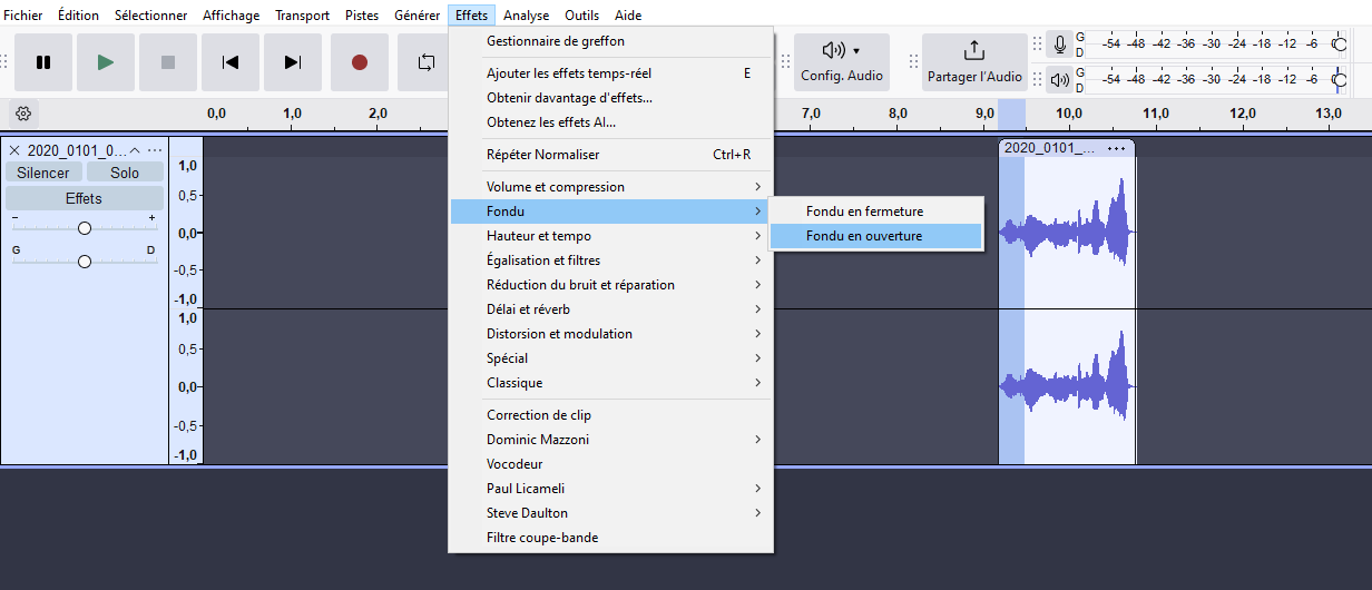 Ouvrez Audacity et commencez par nettoyer l’enregistrement de votre voix (voir tuto: ici ou ici). Ajoutez votre musique, calez la comme vous le souhaitez et ajuster le volume sonore pour faire ressortir la voix (voir tuto : ici).